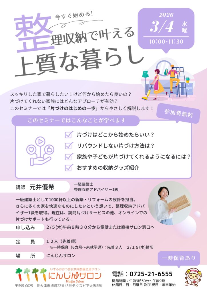 心もお家もスッキリ!【整理収納講座】をにんじんサロンにて開催! 「片付けのはじ...
