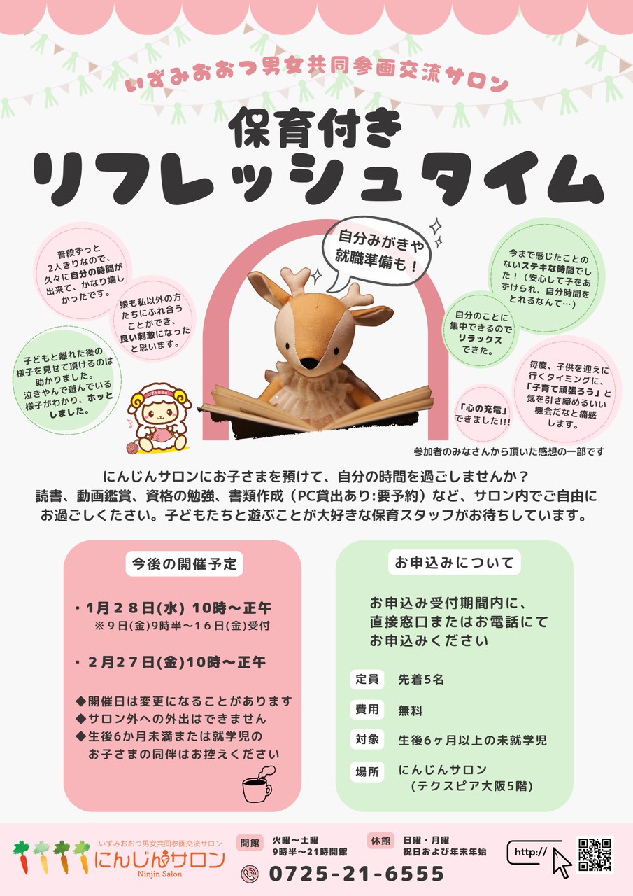 お子さまを別室でお預かりし、保護者の方にはにんじんサロンでゆっくり過ごしていただきます