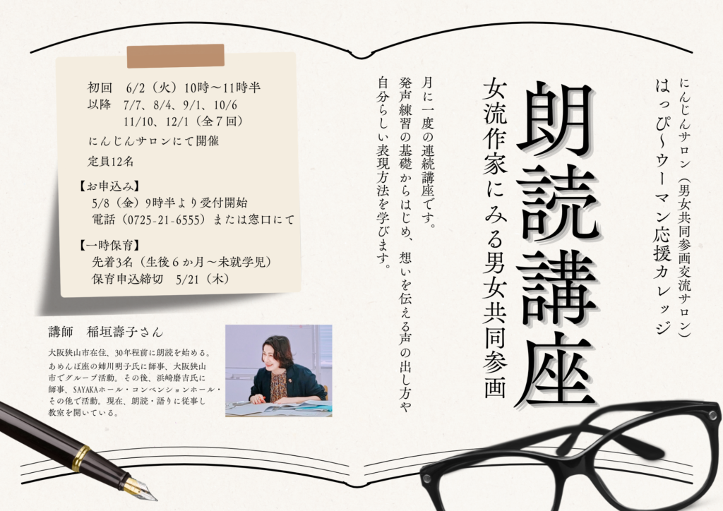 大阪狭山市在住、30年程前に朗読を始める。あめんぼ座の姉川明子氏に師事、大阪狭山市でグループ活動。